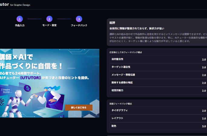 作品をアップロードするだけ で、具体的な評価が得られる。目的にあわせた設定の変更も容易。適切な評価結果を得るためには、生徒自身でプロンプトエンジニアリングや追加の入力が必要。