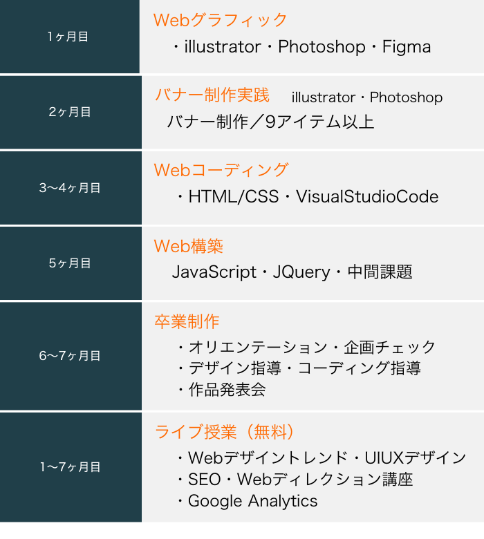 【期間】Webデザイナー専攻:6ヶ月+バナー制作実践:1ヶ月の7ヶ月間