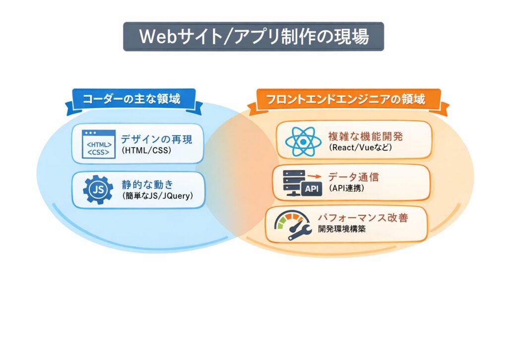 コーダーとフロントエンジニアの違いは?仕事範囲とキャリアパスを図解で解説!