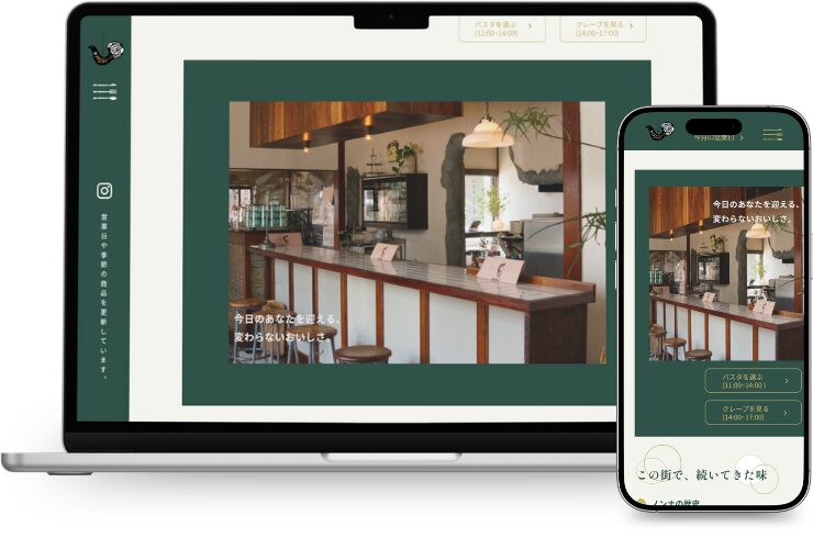 落ち着いた配色と統一感のあるデザインは、店舗の雰囲気を丁寧に表現しています。