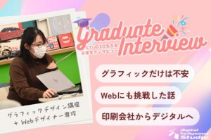 デジハリ名古屋卒業生Kさんのインタビュー記事。未経験からグラフィックデザインを学び、ケーキ店店長からデザイン職への転職を目指すリアルな体験談を紹介します。学習中の不安や1日のスケジュール、卒業制作、ポートフォリオ制作への取り組みまで詳しく解説。名古屋でWebデザインスクールを検討している方必見の内容です。